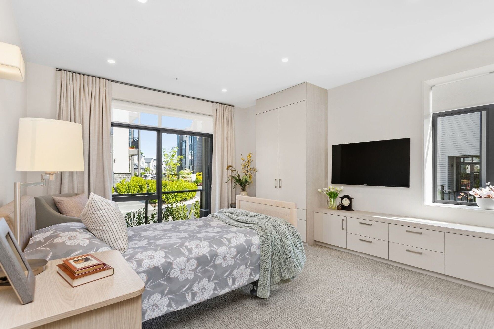 The cabinetry within the care suite has been carefully considered to be both practical and aesthetically pleasing. Crafted storage space for clothing and footwear, as well as a built in sideboard for residents personal objet d’art and memory accoutrements. All care suites boast a 55 inch television for resident enjoyment. Upholstered bed heads add a residential feel, with an reversible coverlet affording personal choice.