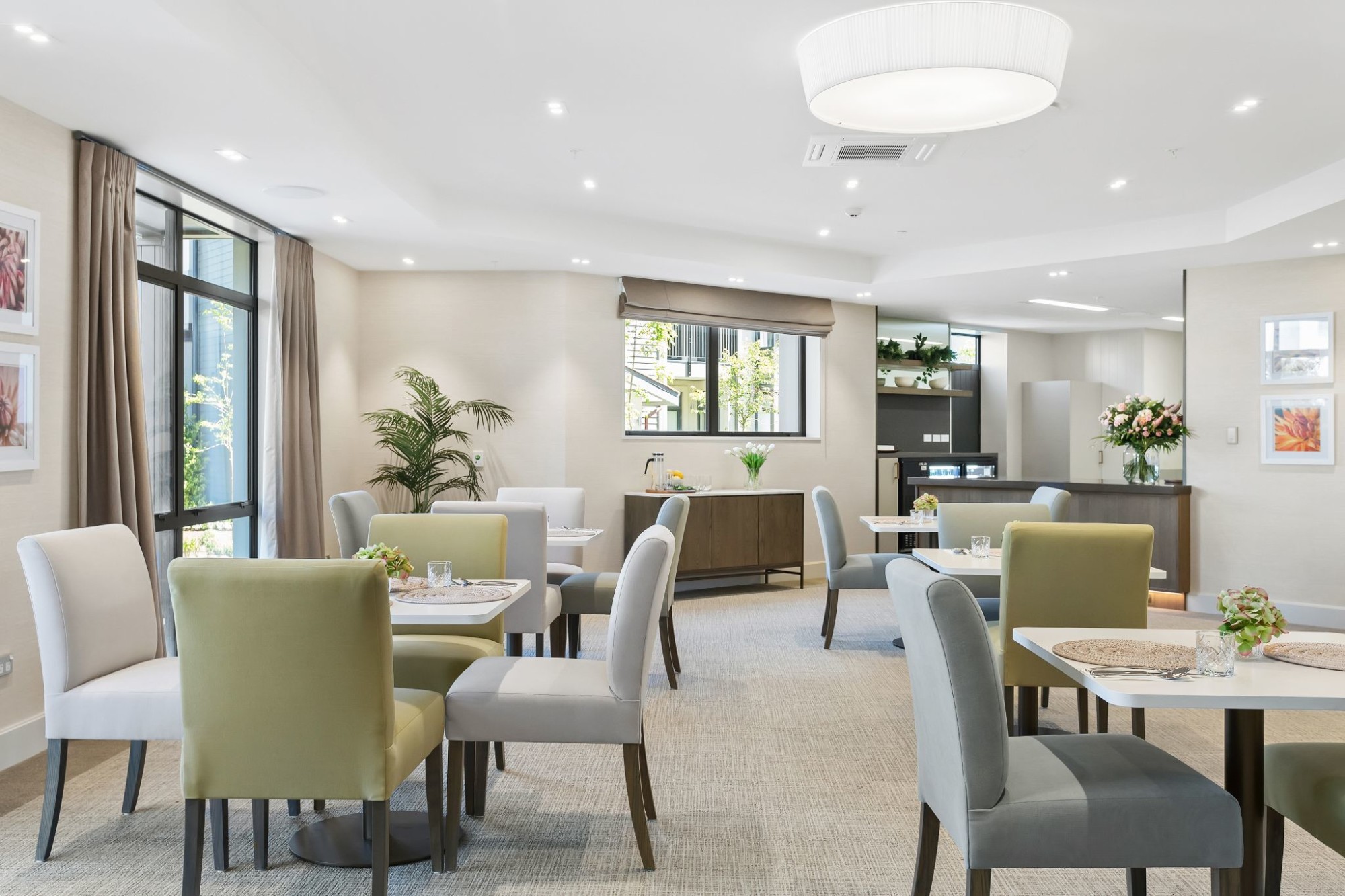 The window treatments have both fabric drapes to soften the room and add a sense of home; as well as sun blinds to provide residents the flexibility with light and privacy. All suites have been designed to accommodate an integrated ceiling hoist should our residents require. Individually controlled air conditioning enable residents to personalise their care suite temperature.