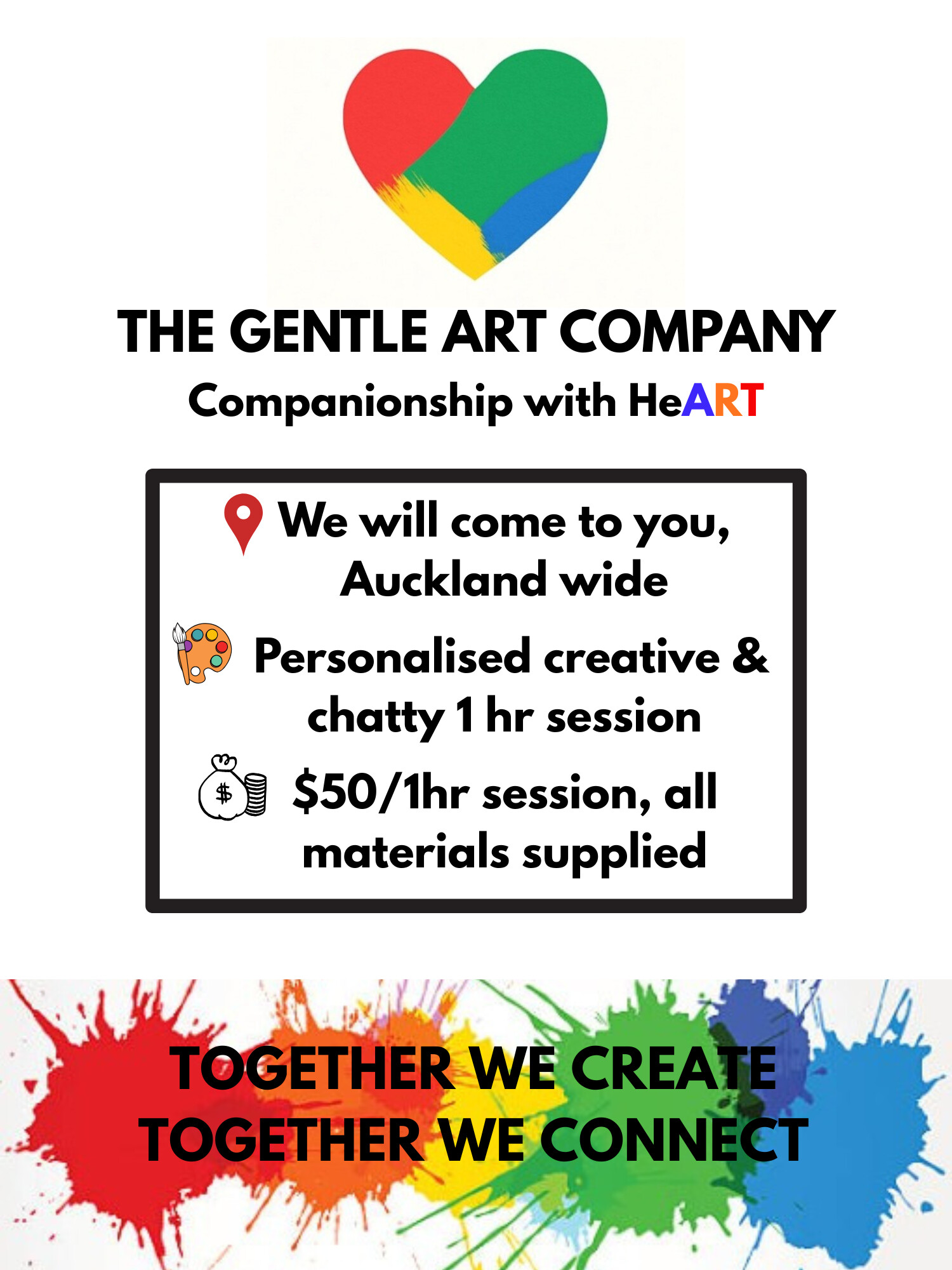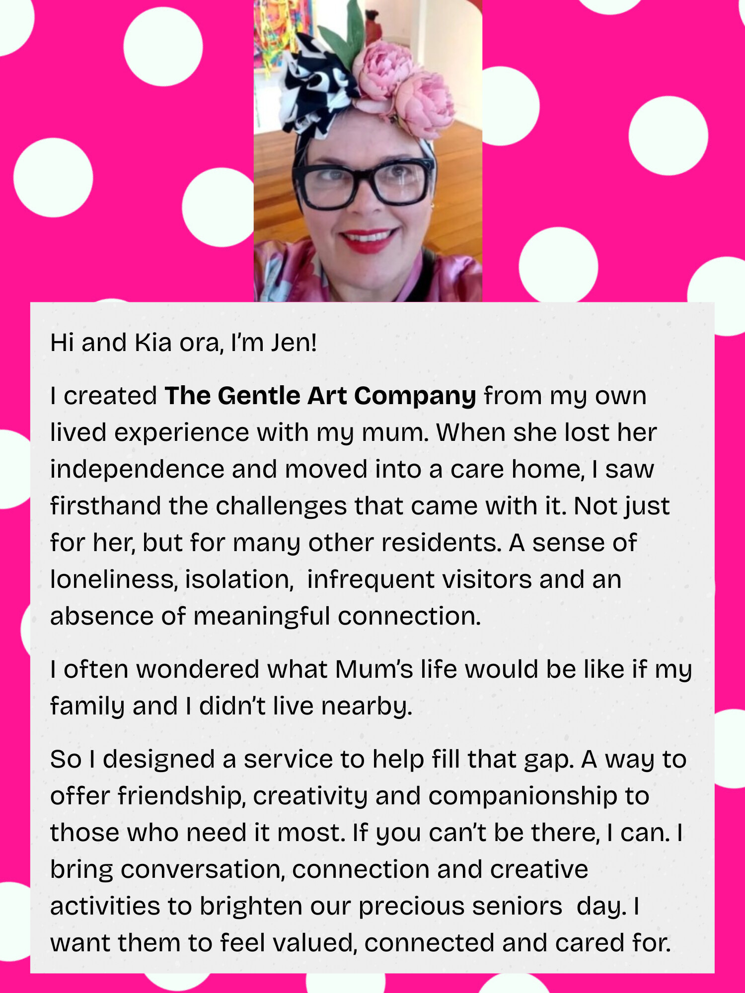 | Hello and welcome! I'm Jen, the founder of THE GENTLE ART COMPANY This venture was born out of my own experience with my mum after she went into care. She’s now in a wonderful home and very well looked after. However, I often noticed how busy the staff could be at times. How some residents, especially those without family nearby, could go long stretches without visitors. When someone’s world becomes four walls, it’s easy to withdraw and lose that vital sense of connection. This was a real concern to me, I felt great compassion for those residents and their families. So I set about creating a solution, to keep our older whānau engaged in life. The Gentle Art Company was born. WHAT I OFFER: I provide a mobile Art & Companionship service across the North Shore and greater Auckland. Each visit lasts an hour, where I spend quality 1 on 1 time with you. I always bring along a creative activity, thoughtfully tailored to your interests. There’s absolutely no pressure to complete the artwork. Creativity is simply our vehicle for connection. Many activities have a gentle, vintage feel, encouraging and prompting conversation and the sharing of memories. Have a look through the images, to get a sense of the kind of art we may explore (this is just a snap shot). I want to approach older people with art that is interesting, perhaps outside of what they may already know. If an creative activity interests you, but you think it may be too difficult for you. I will help you to achieve the outcome you want. Guiding, adjusting and making the activity accessible to you. * I am very sustainably minded, I bring these principals to The Gentle Art Company. Even the scrap paper from our sessions is turned into papier-mâché, for future sessions. All materials are sourced from local charity, The Northshore Resource Centre; who specialise in art and craft supplies. I’ve also created conversation cards with light, thoughtful questions to help spark dialogue (however, as talking is one of my superpowers, we often don’t need them)! I bring along all the materials, so there’s nothing for you to prepare, except to expect my arrival. IN A NUTSHELL: Session cost: $50 (payable on or before booking) Location: In-home or residential care visits Duration: 1 hour of companionship and creative engagement What’s included: A curated creative activity designed around your interests and hobbies You can book me as often as you like! There's no minimum or maximum. I offer a subscription of 10 sessions for $450 - discounting each session to $45, saving $5 per session. There’s no obligation to take part in the art; if you'd rather chat, reminisce, or simply enjoy each others company, that’s perfectly fine! Companionship comes in many forms: painting nails, gentle hand massages, looking through old photos, playing a game, reading together, or simply sharing stories. I’m there to meet your needs, in that moment. The first session is free and a meet and greet and an opportunity to address any questions you may have. It's a chance for me to learn what sparks you and what your ability is. This allows me to design your sessions to your capabilities and interests. I’m dedicated to making each session as enriching, joyful and supportive as possible. * I do not offer personal care or outings. MY APPROACH: I always match your energy, pace, mood, and ability. Nothing will ever be too difficult or demanding. My goal is for our hour together to be the brightest hour of your week! I’m motivated by joy, compassion, the simple power of human connection and the stories we share. Do you feel like companionship and creative stimulation is missing from your life and you'd benefit from some 1 on 1 connection and enjoyable creative time? I’d absolutely LOVE to hear from you! It would be my utmost pleasure to spend time with you, especially if friends and family are far away. Thanks millions for reading, I look forward to chatting over how we can bring some joy and meaningful interaction, to your life! You are WORTH it! |
