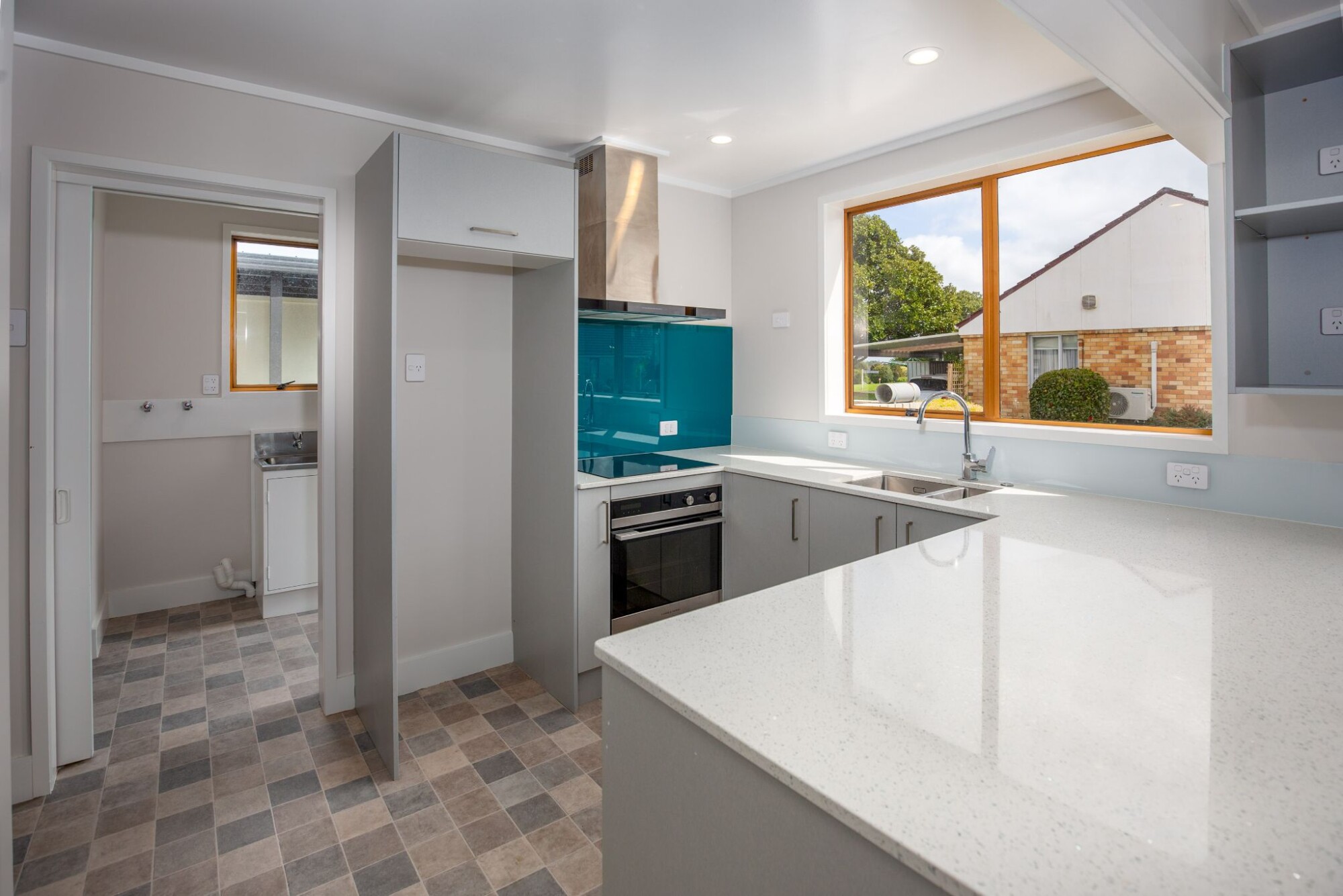 In a quiet cul-de-sac at the top of the village, you step into the home via a covered entrance, with space to hang your coat. The kitchen is modern, with plenty of cabinetry, built in under bench oven, 1 ½ sinks, insinkerator, rangehood, induction cooktop, dishdrawer, pull out shelves in that normally tricky corner cupboard, and all of the appliances are Fisher & Paykel.