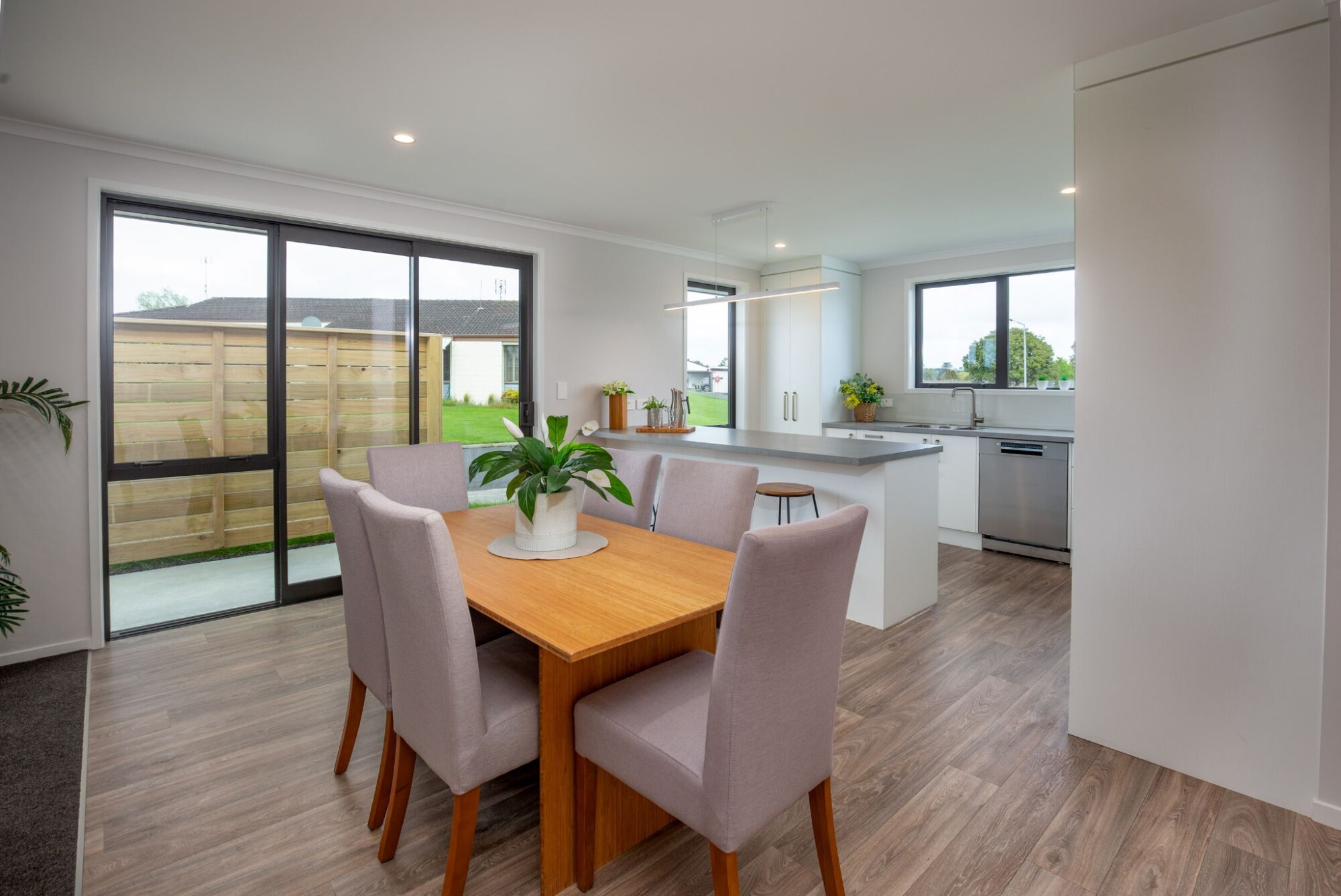 Enjoy comfort in every season with a heat pump in the living room, and keep things sleek with a hidden cupboard for your TV fittings. The dining area also flows outdoors through stacker doors to a private patio, complete with a privacy screen for relaxed alfresco dining.