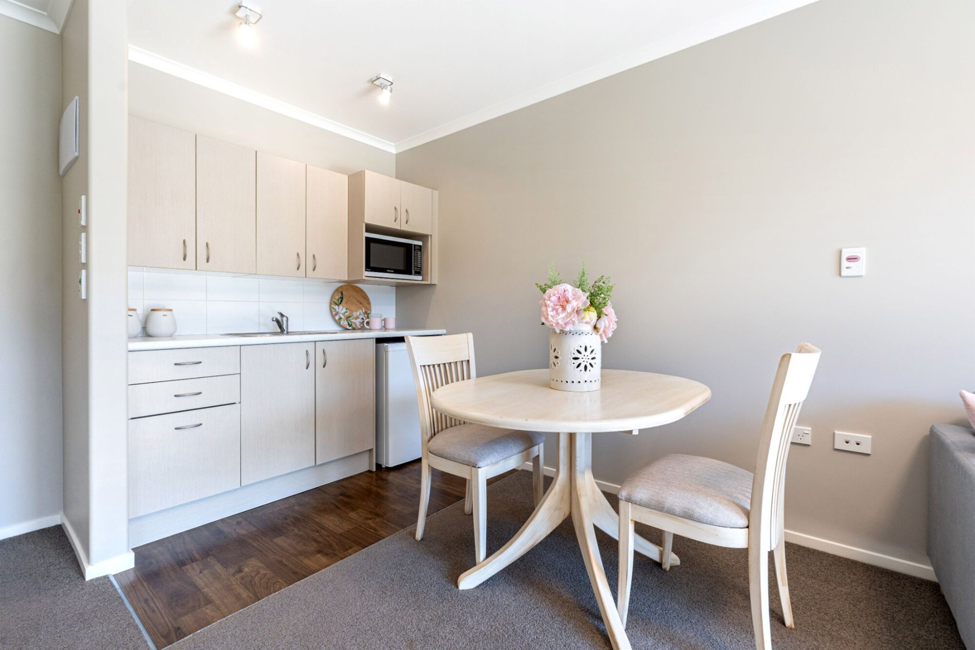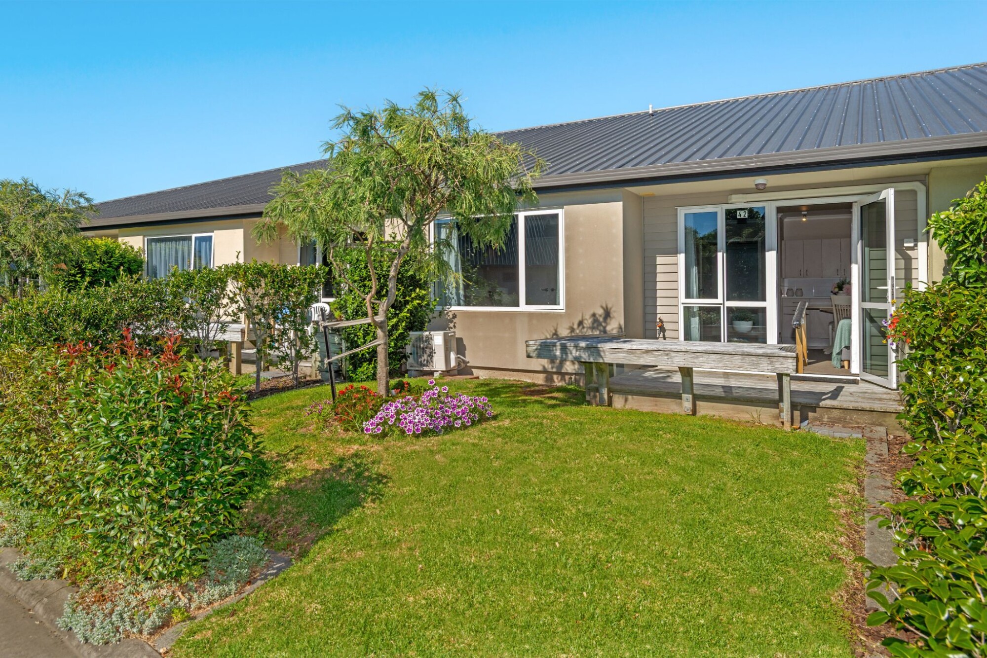It has a sunny deck and the apartment is on the ground floor. The apartment has a separate bedroom with a generous lounge with kitchenette, and a large bathroom offers a wet area shower. On call buttons are located in the bedroom, lounge and toilet. It has a garden with a raised planter on the deck to plant the flowers of your choice.