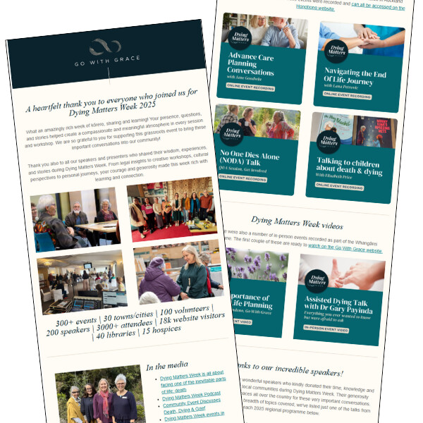 Go With Grace is a website offering gentle guidance, information, support, resources and peace of mind for those getting their affairs in order, caring for whānau, grieving or facing the loss of a loved one. We also help organise Dying Matters Week, a national event supporting people in New Zealand to start conversations, learn from experts, and feel empowered to put end-of-life planning in place to create peace of mind for themselves and their loved ones.