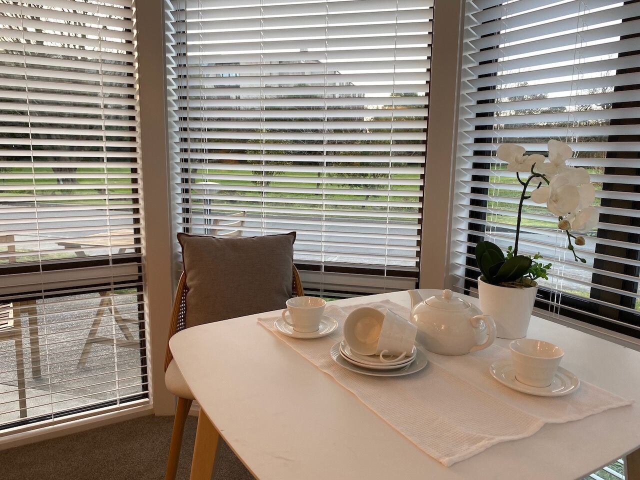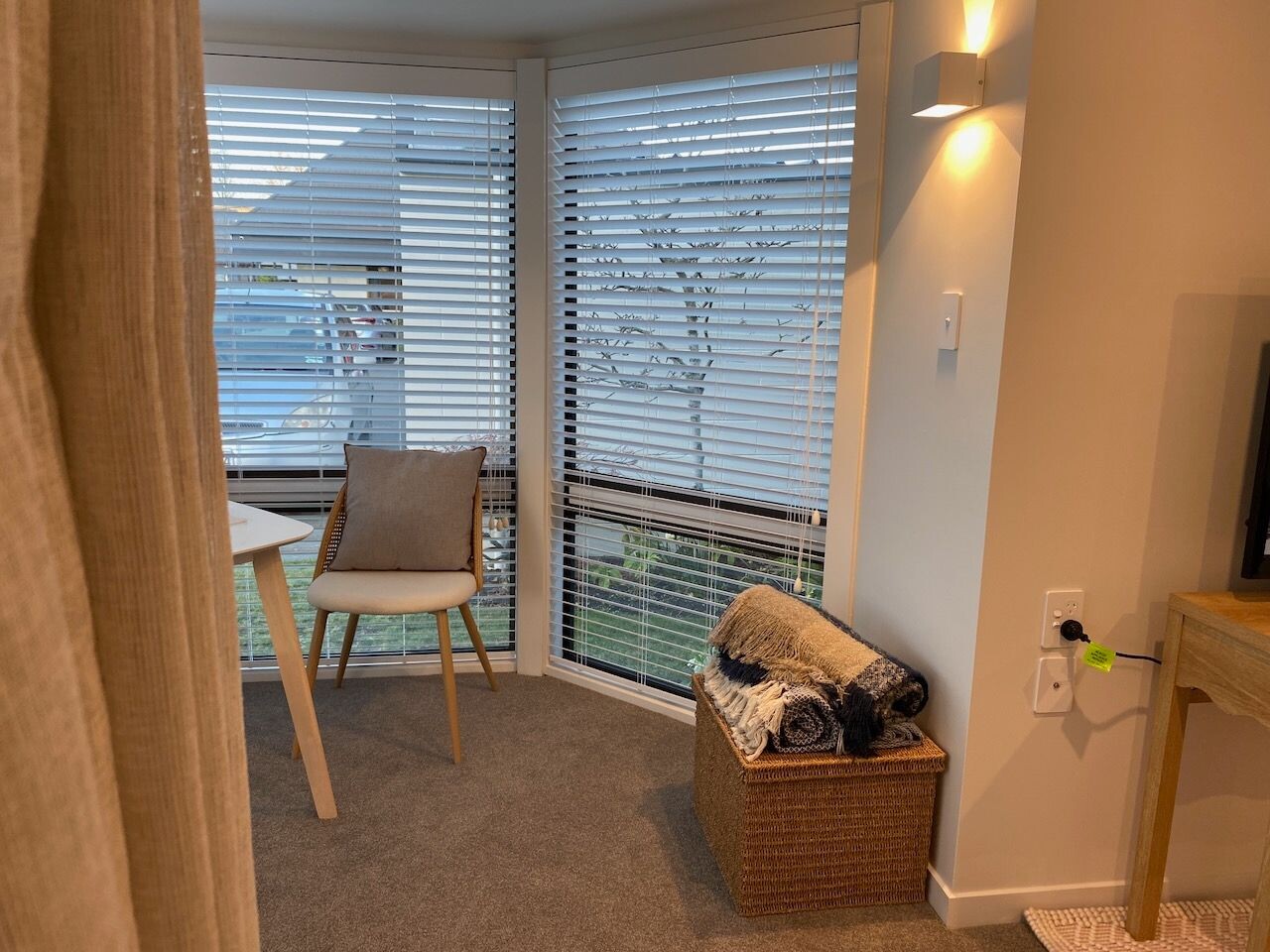 Enjoy the ease of the dual-track curtain system complemented with blinds in the living and kitchen areas for a contemporary vibe.