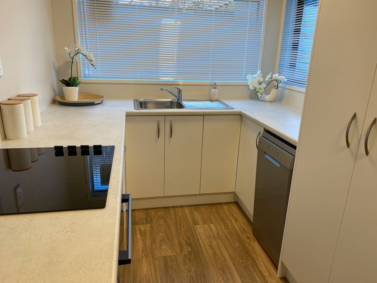 Step inside to discover a new well-appointed kitchen featuring an electric hob, oven, range hood, and easy-care vinyl flooring. The open-plan dining and living areas, complete with plush carpet and a heat pump for year-round comfort, provide a welcoming space to unwind.