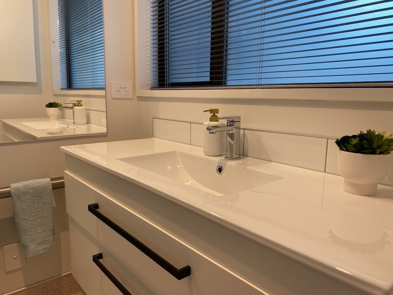 The bathroom boasts a vanity, shower, heater, and heated towel rail, complemented by practical vinyl flooring. A separate toilet is conveniently located off the laundry.