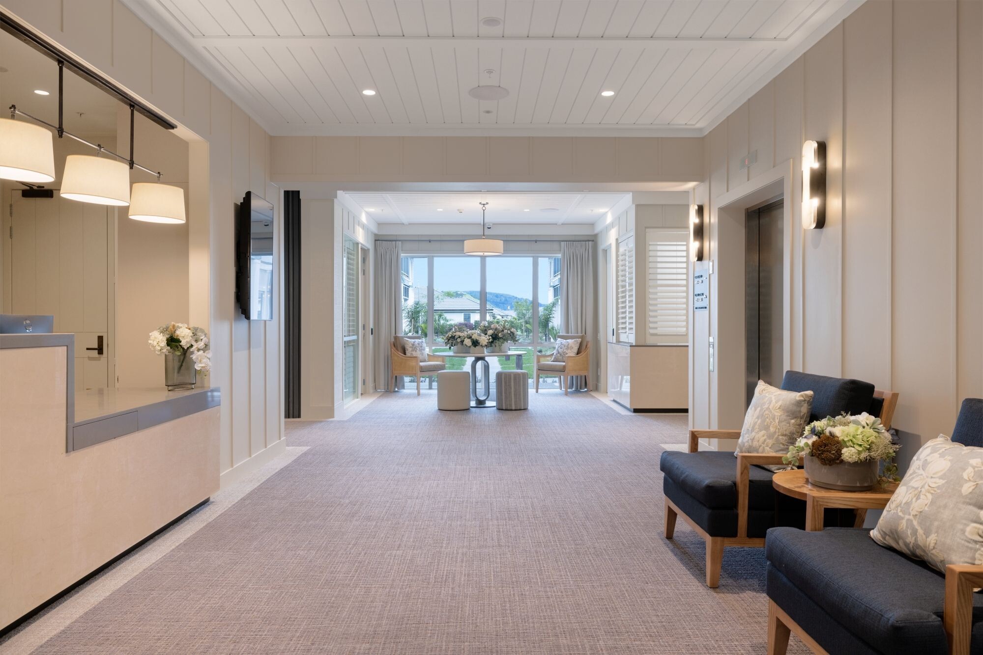 The lush, resort-style grounds are meticulously maintained, adding to the calming atmosphere. Residents who enjoy water activities can take advantage of the indoor swimming pool, while the glass-paneled balcony, transformed into a hanging garden, encourages dexterity and nurtures a green thumb. Memory Care also features its own dedicated lounging and dining suites, providing a safe, comfortable space for residents to relax and dine.