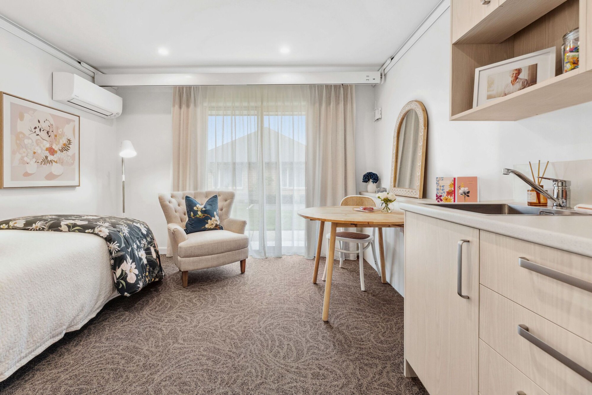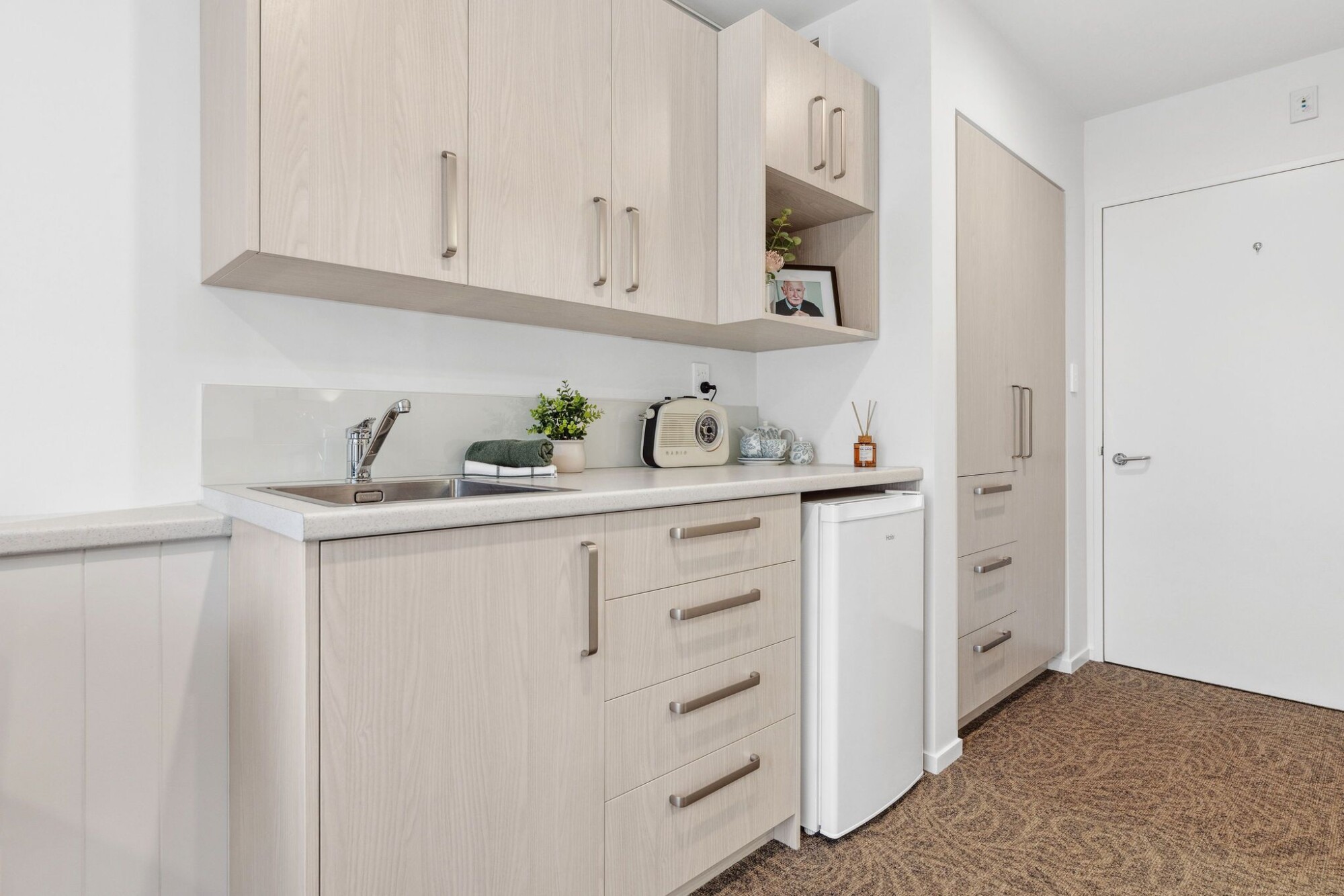 Our Care Suites offer space, flexibility and extra features. Suitable for either Rest Home or Hospital care, you don’t have to move if your needs change between these levels. All Care Suites come complete with a heat pump and full en-suite bathroom, as well as a kitchenette with a fridge and space for a kettle – perfect for making a cuppa when friends and family come to visit. You own the right to occupy your Care Suite, so you can personalise it with your favourite furniture and treasured pieces. A Health New Zealand – Te Whatu Ora assessment is not required for care that is paid for privately.