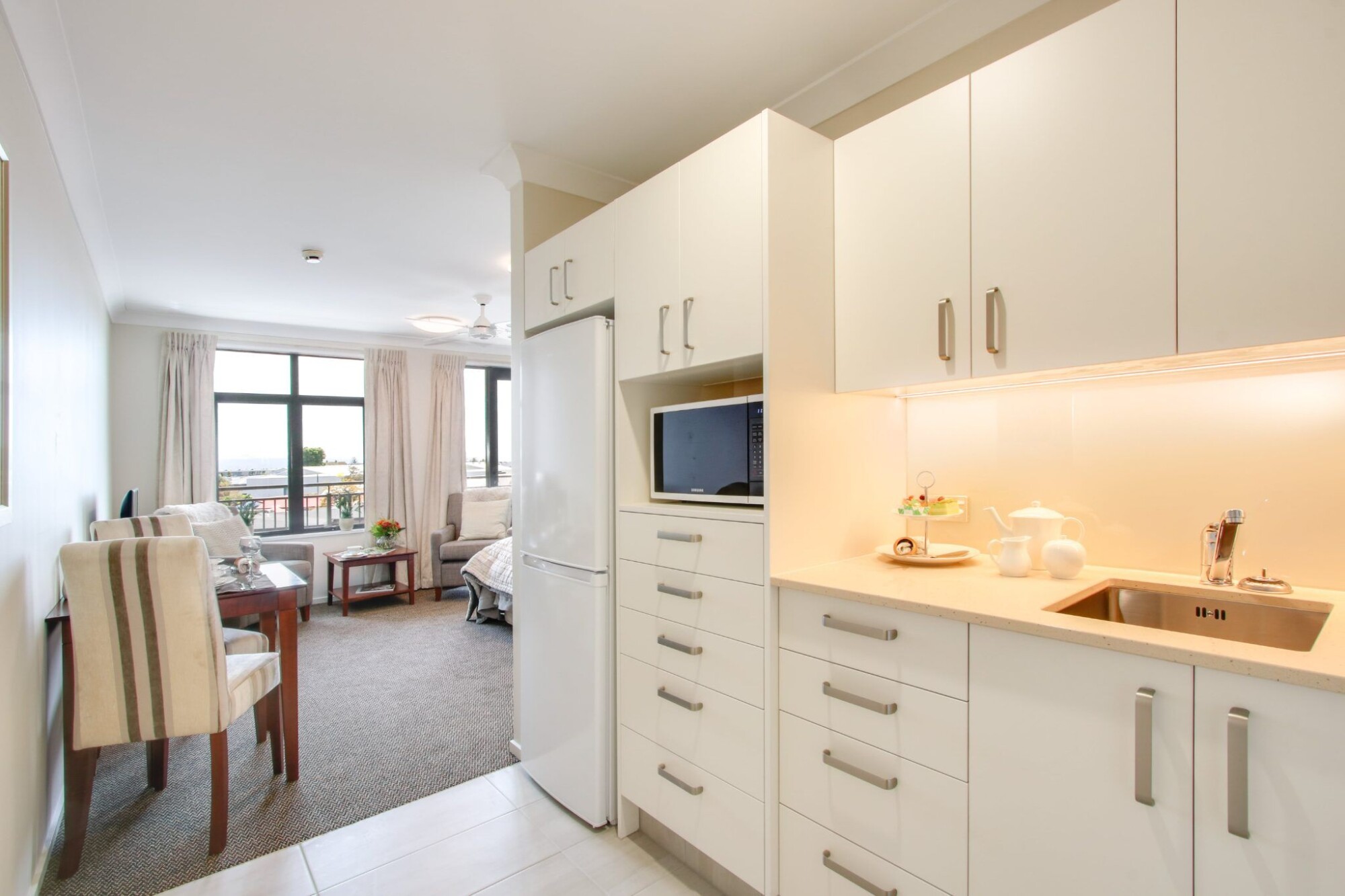 Serviced apartments give you the perfect balance of independence and support. Apartments feature a modern open-plan living area, an ensuite, and a kitchenette complete with a fridge and microwave.