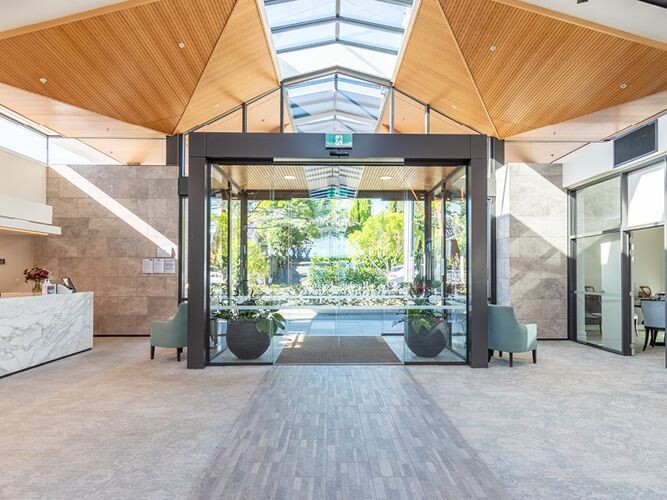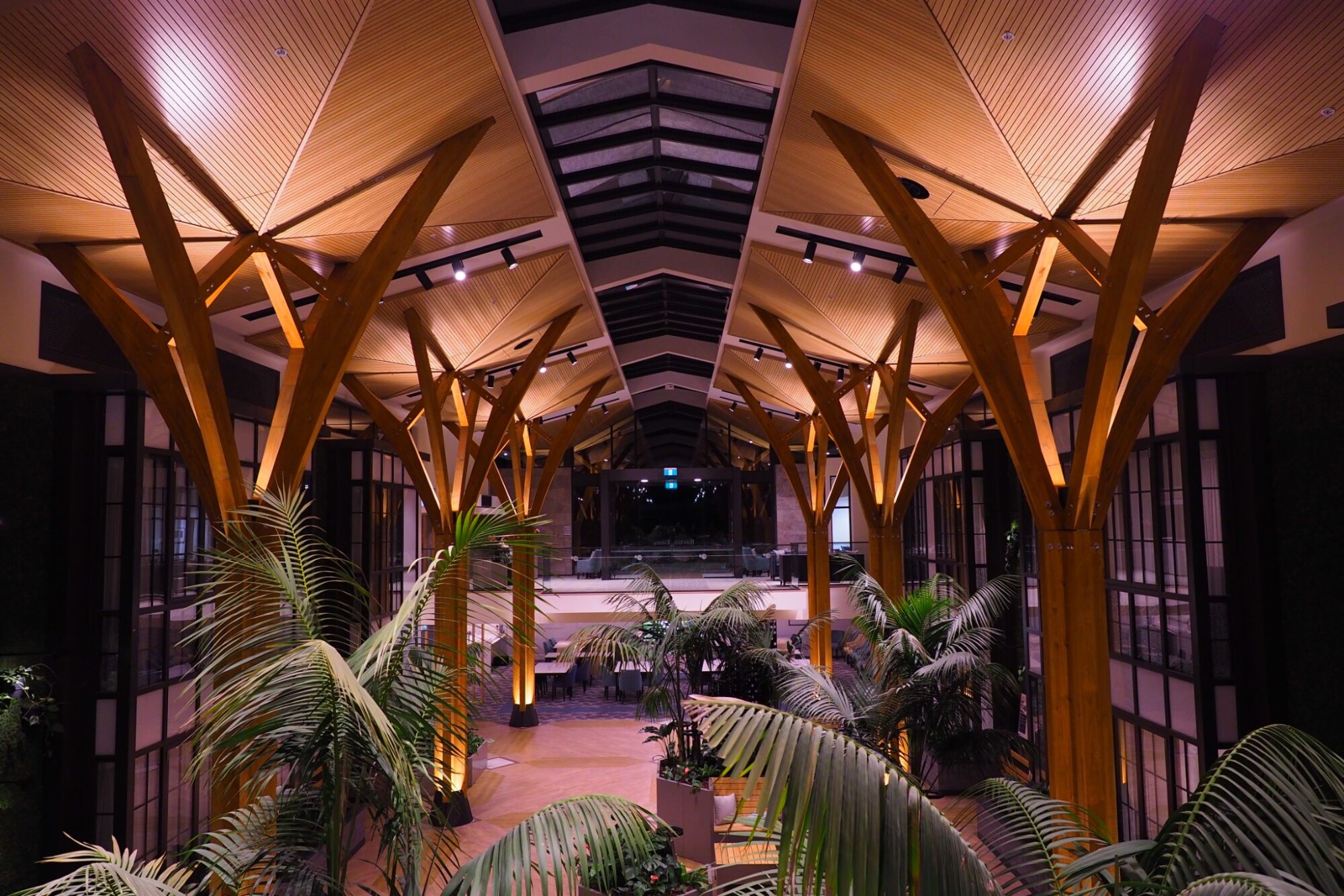 This artistic aesthetic flows through to the atrium, which is lined with pillars inspired by New Zealand's iconic Nikau palm trees. Beneath the canopy of the pillars, nestled in the heart of the atrium is a beautiful garden, complete with flowering plants and moss walls that brighten and breathe new life into the vibrant and open space.