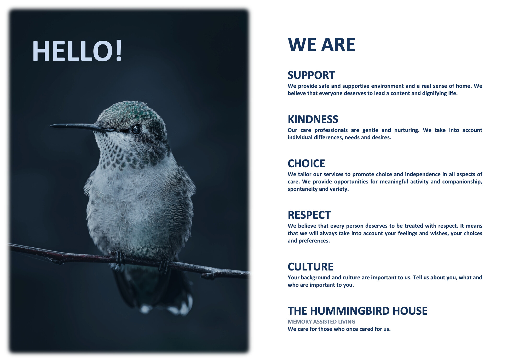 The Hummingbird House aims to deliver quality care for your loved ones. Fostering a homely environment, filled with love, kindness and respect.
