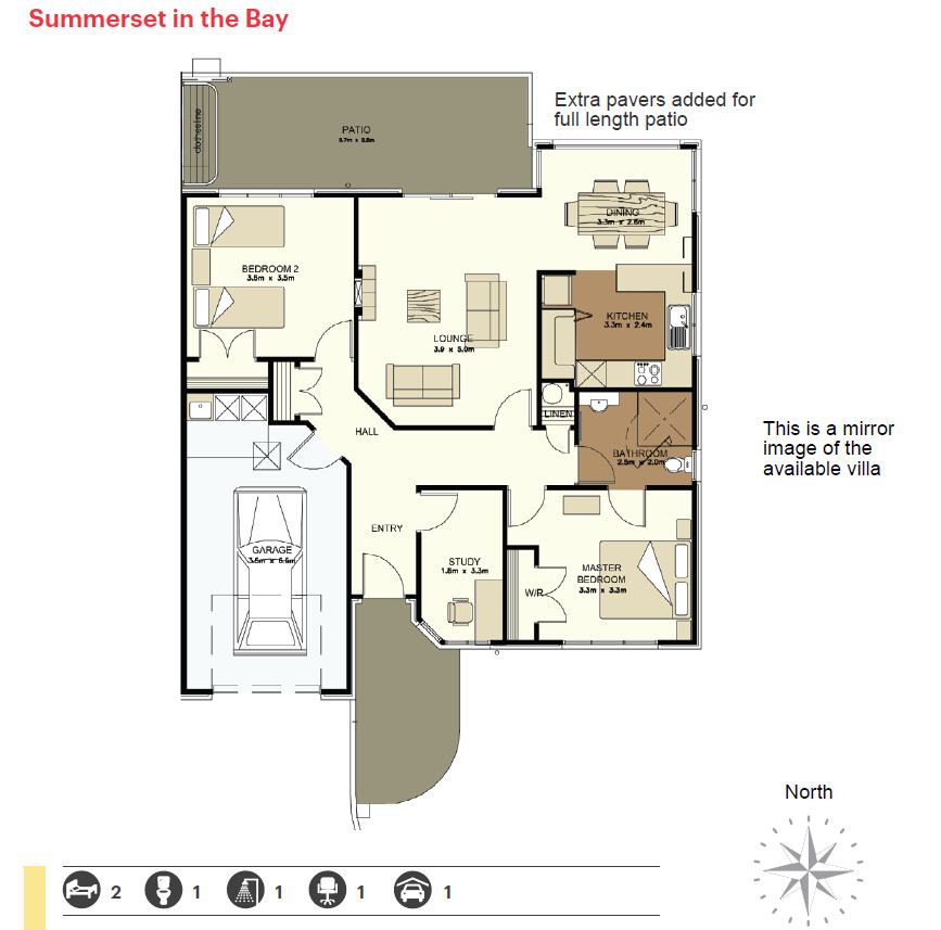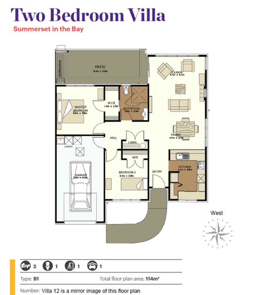 This villa is situated on the boundary of private homes along Merlot Drive providing a north-facing patio that runs the length of the villa with the gifted extra of a large canvas sunshade in a peaceful, private setting. This floor plan is our most spacious with two bedrooms, a study, U-shaped kitchen with amazing storage, separate dining area, and a large lounge. Plentiful cupboard and wardrobe space plus a large single car garage with laundry area and internal access.