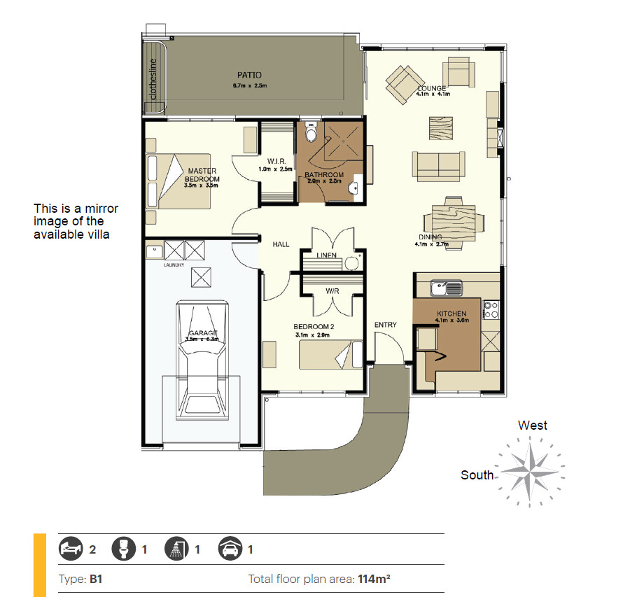 Two-bedroom villas are a bit rare, we only have 18 in this village, (and 76 villas are two bedrooms with a study.) This particular villa is situated with lovely green garden space on the boundary of Church Road which provides an expansive outlook from windows that are floor to ceiling in the lounge. Great proximity to our Village Centre (main building), 114sqm including excellent wardrobe and closet spaces, open plan living, a brand new U-shaped kitchen, and a large single garage with a laundry area.