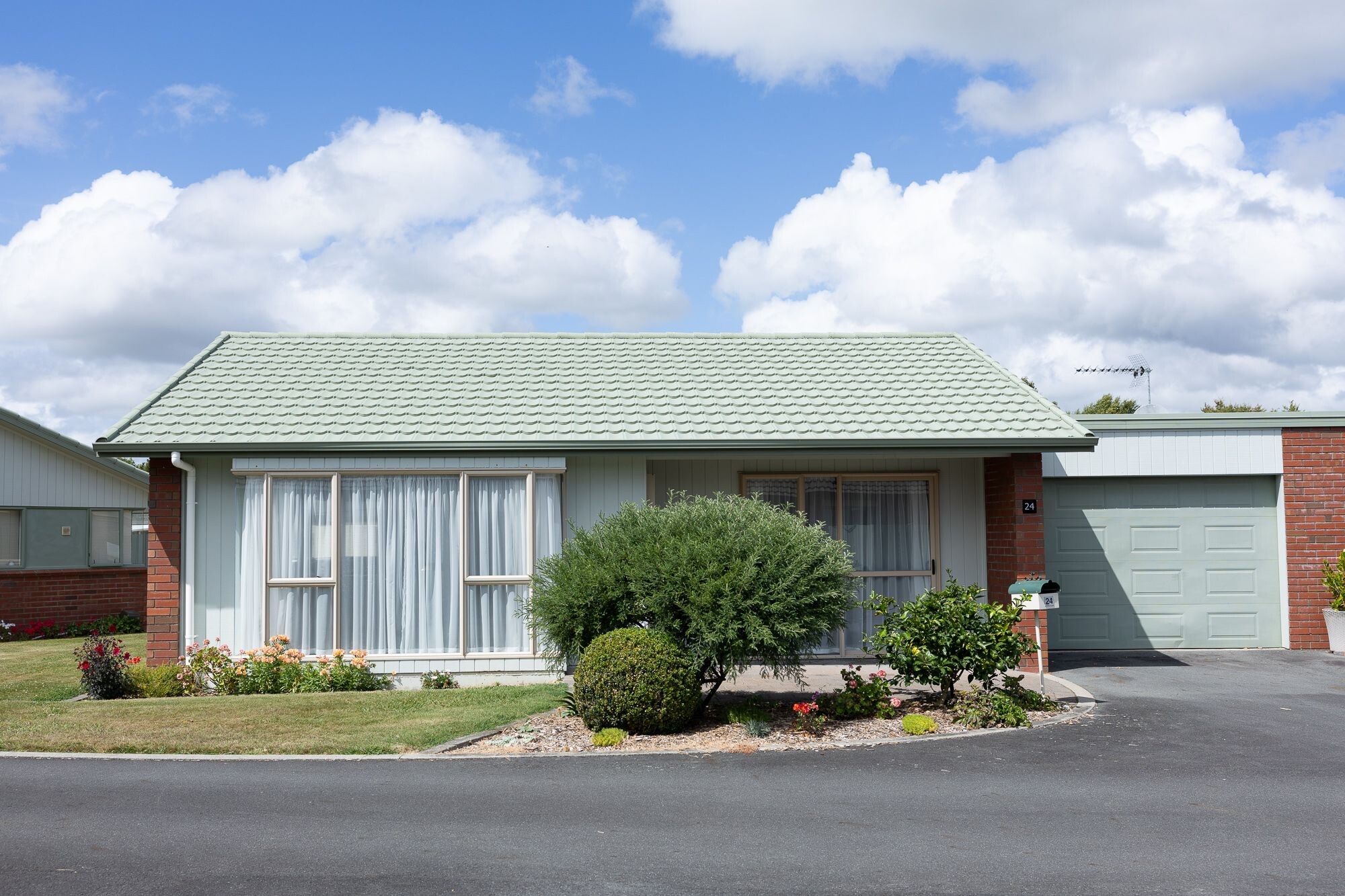 North facing and sunny. Beautiful gardens. All on a level area.