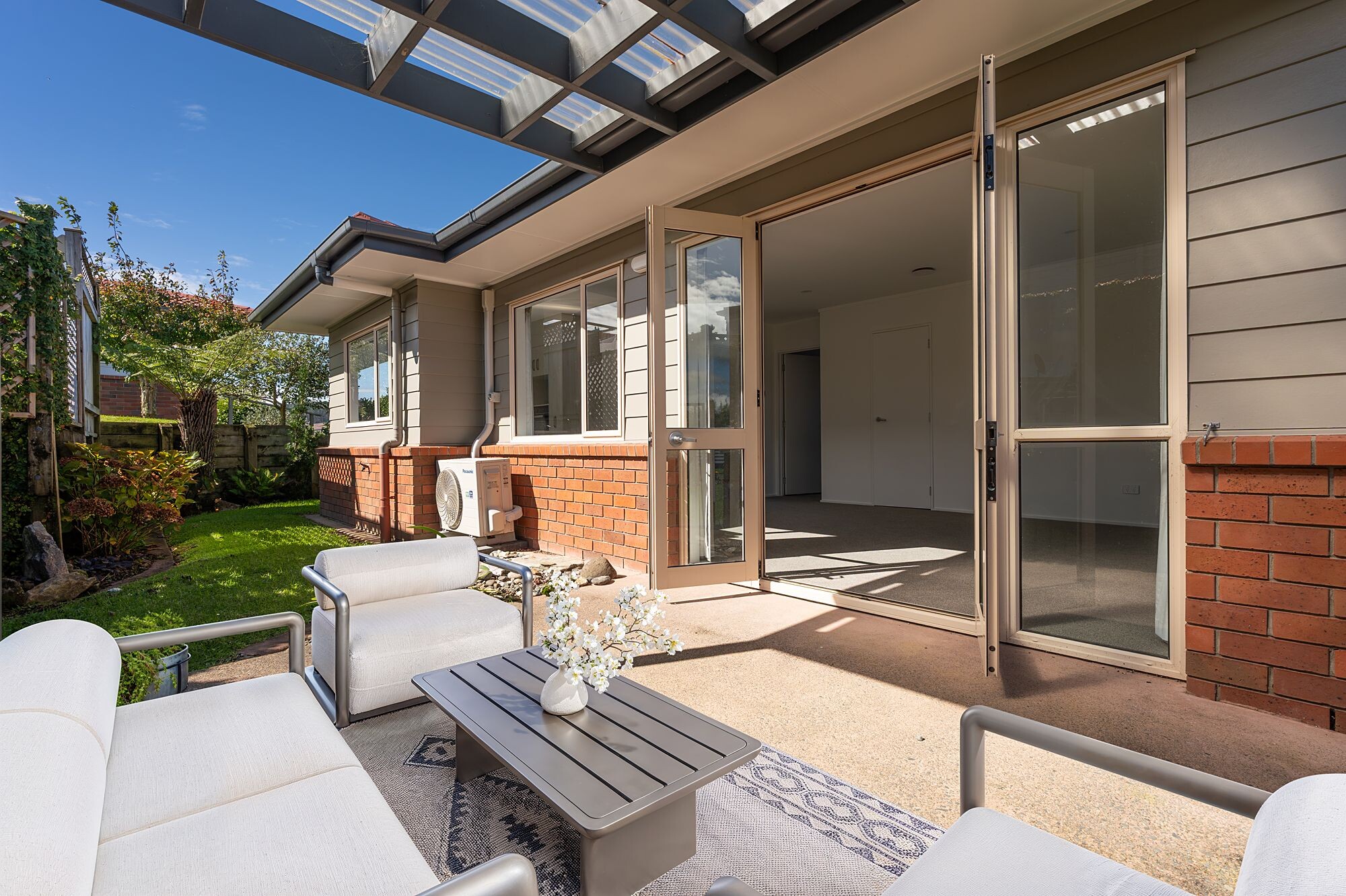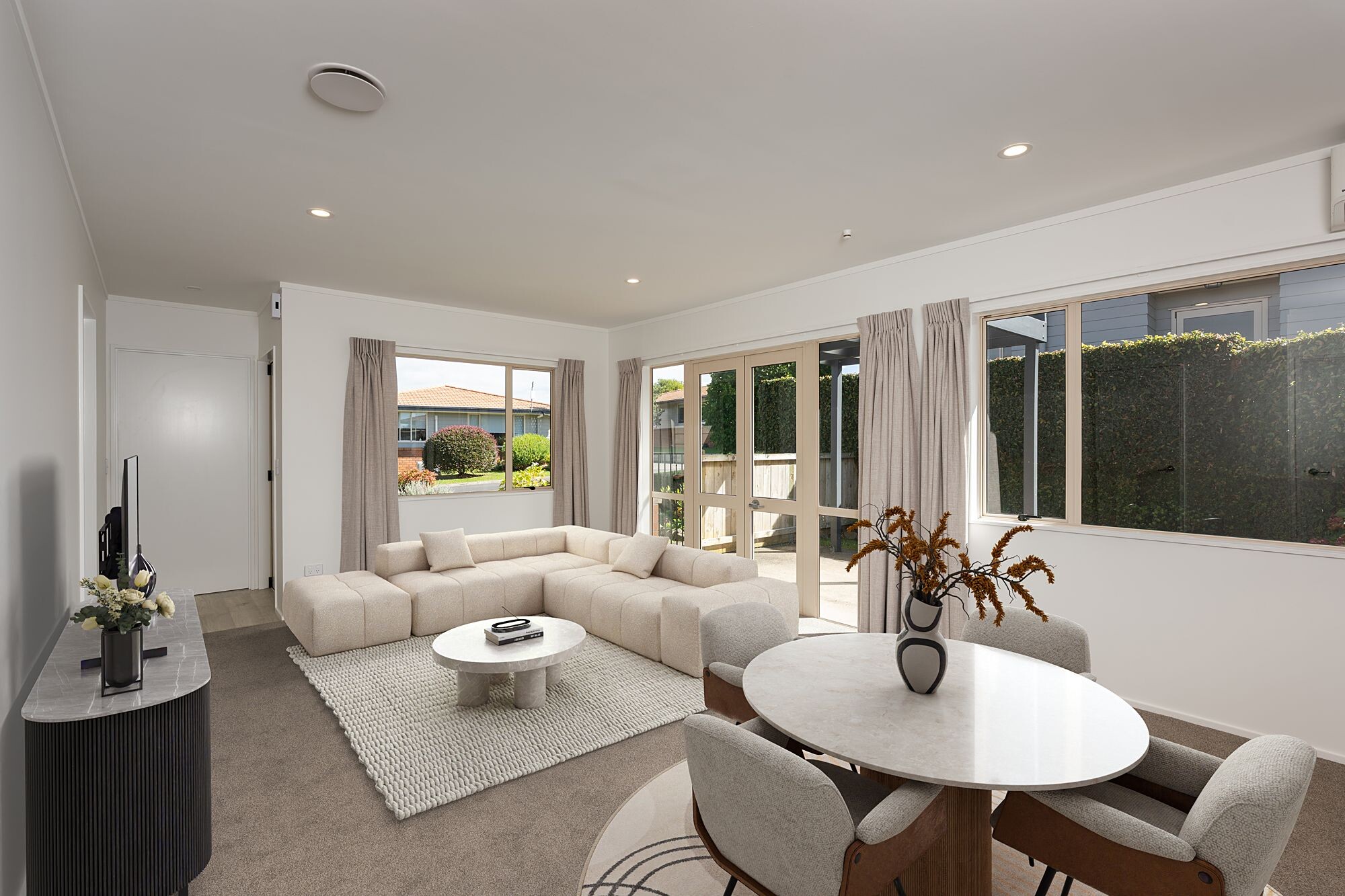 Apartment 100 features: two bedrooms with generous wardrobe space; a modern, accessible bathroom with integrated laundry area; washing machine and dryer included; emergency call system linked to St John Medical for added peace of mind; LED lighting and multiple power points throughout; heat pump for year-round comfort; secure basement parking with storage cupboard.