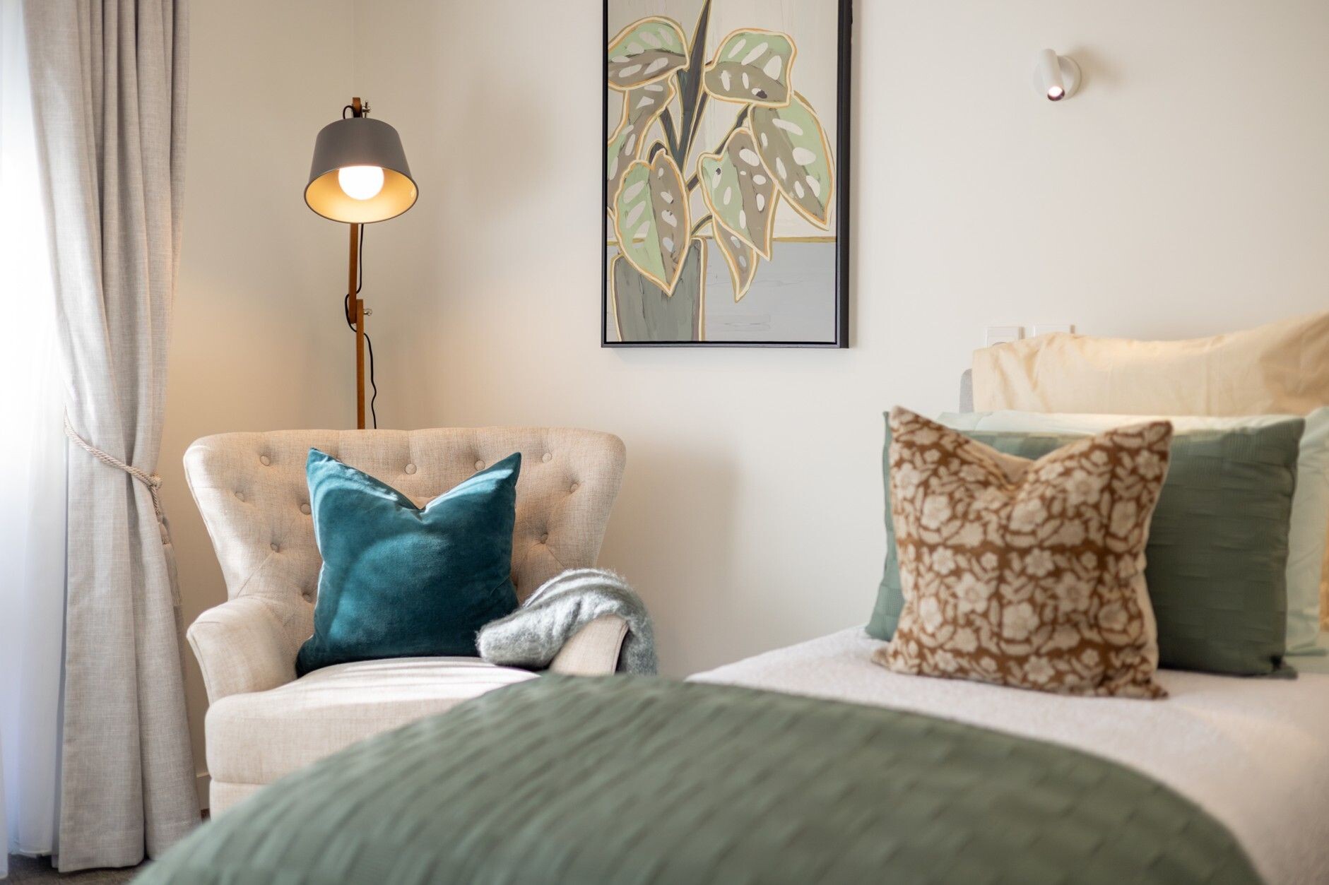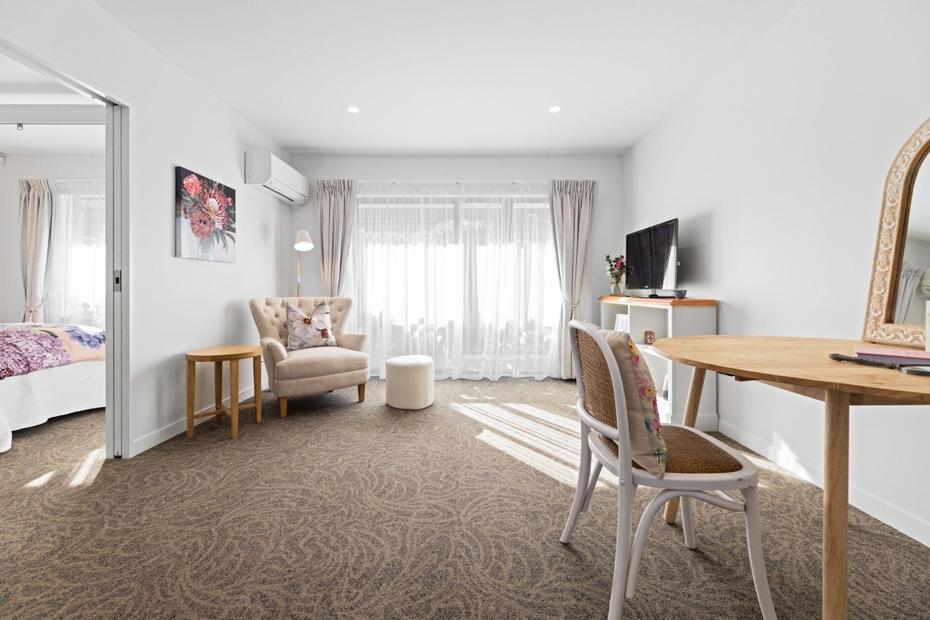 With windows on multiple aspects, the space is filled with natural light throughout the day, creating a warm and inviting atmosphere. The generously sized living area opens seamlessly onto a private patio and garden, offering a peaceful outdoor retreat. Complete with a spacious kitchenette and exceptional proportions throughout, this extra-large Care Suite is a true standout, more akin to an apartment. Ideal for couples or those accustomed to a little more room, it offers a light-filled, comfortable place to call home.