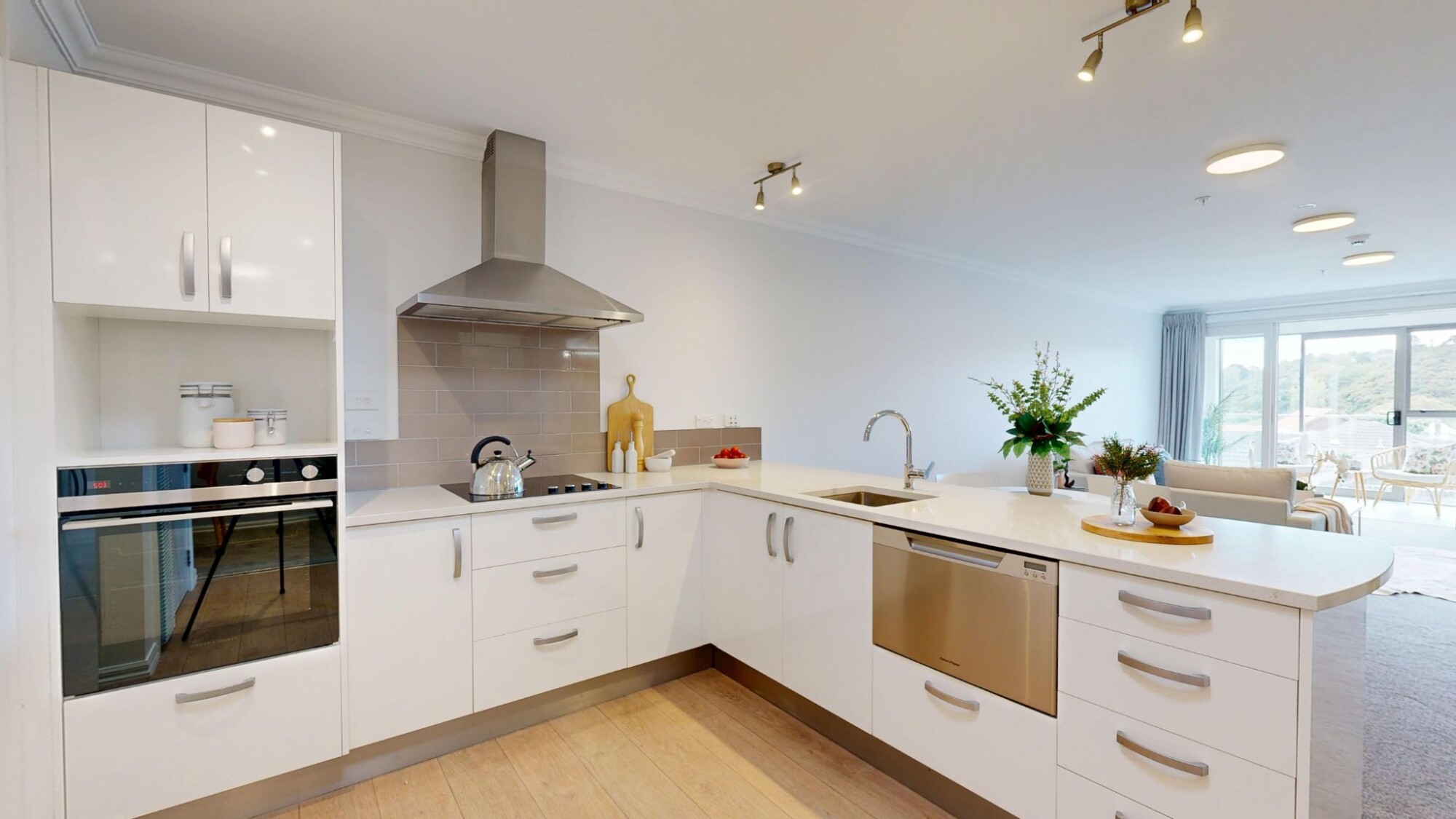 designer kitchen, finished with a refined stone benchtop and all-new premium appliances, seamlessly